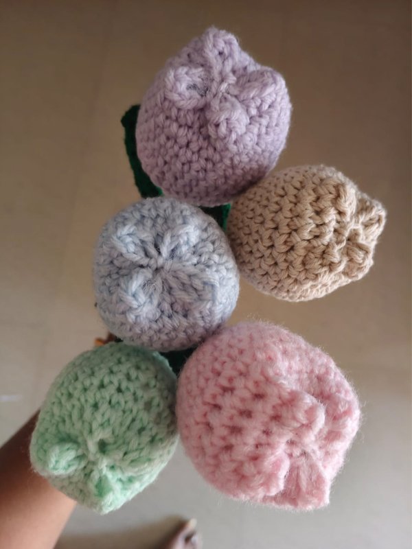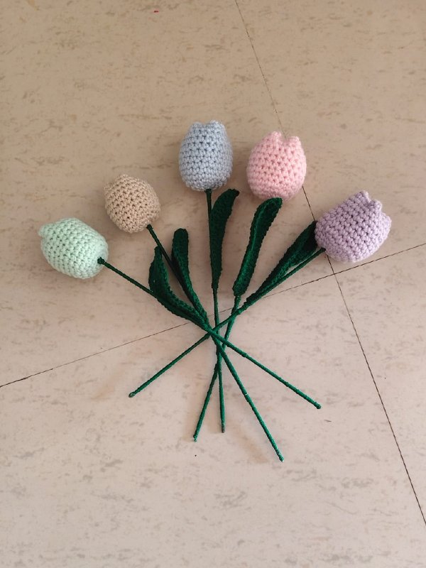 Beautiful Handmade Crochet Tulip Flower 🌷 made with soft yarn, perfect for gifts, bouquets, and home decoration. Available in 11 inches and 6 inches sizes, sold as a set of 5 flowers.